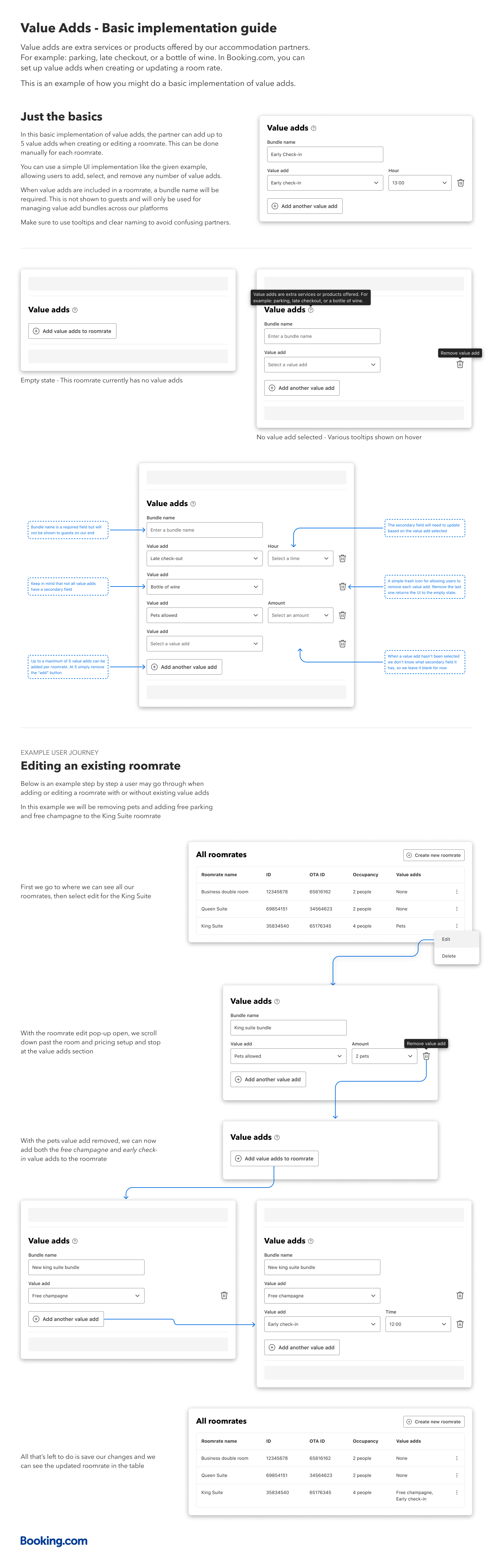 | Attach a value adds bundle across multiple roomrates | No | Yes | The API does not support this functionality out of the box. You must implement a logic where you can retrieve the value-added services based on a bundle name and update all relevant room rates with the same set of value-added services. |